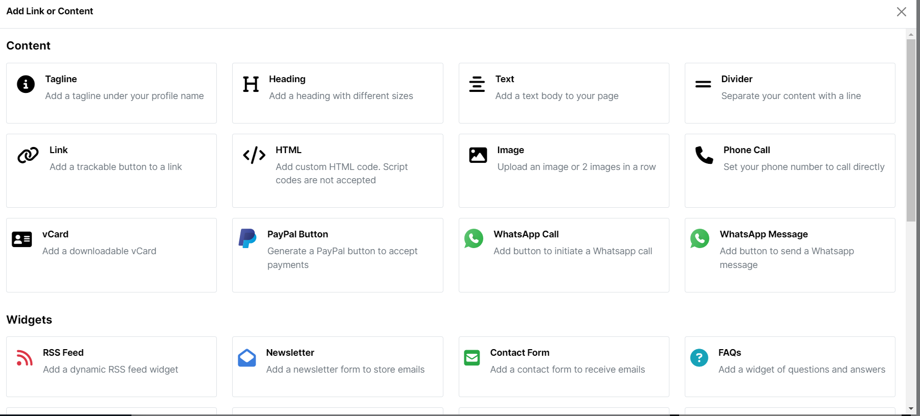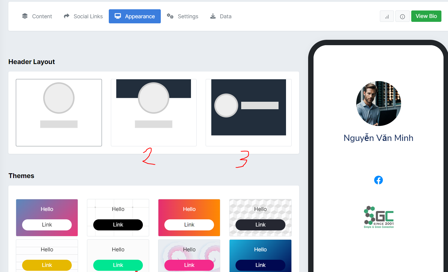 Thiết kế layout cho Bio pages. Với header 2 & 3, bạn có thể upload ảnh làm banner (tương tự facebook)