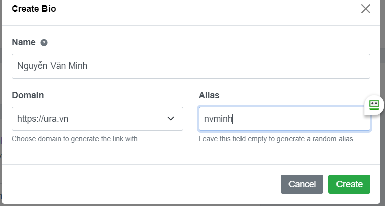 Nhập thông tin của bạn vào. Alias có thể để trống hay nhập tùy ý . Sau đó click 'Create"