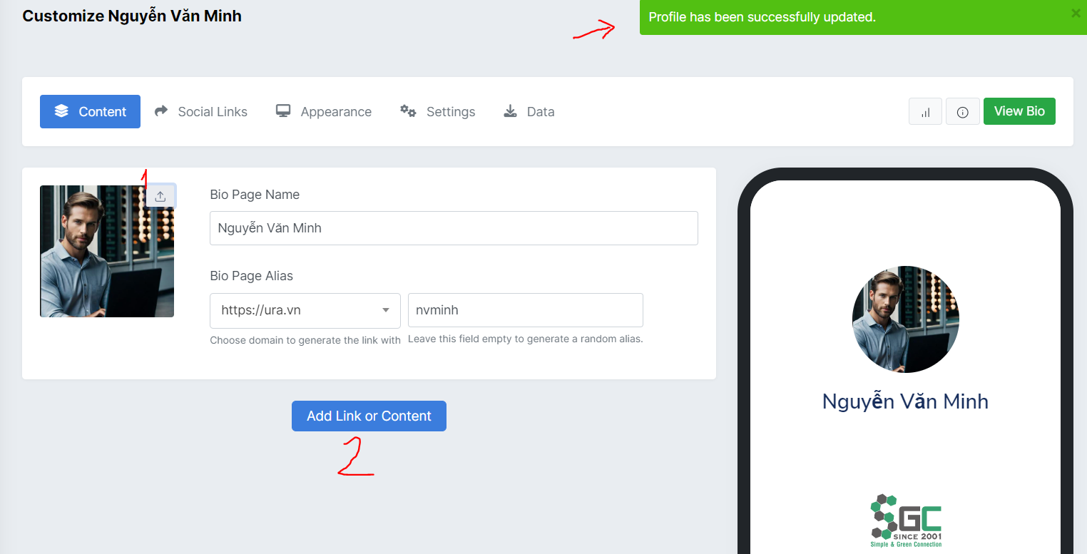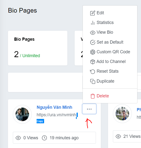 - Duplicate: tạo mới 1 trang Bio page tương tự